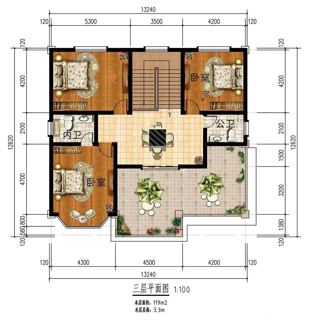 三層:臥室充裕,滿足全家人起居,還能招待親朋好友;露臺(tái)寬敞,滿足日常晾曬,也能打造空中花園