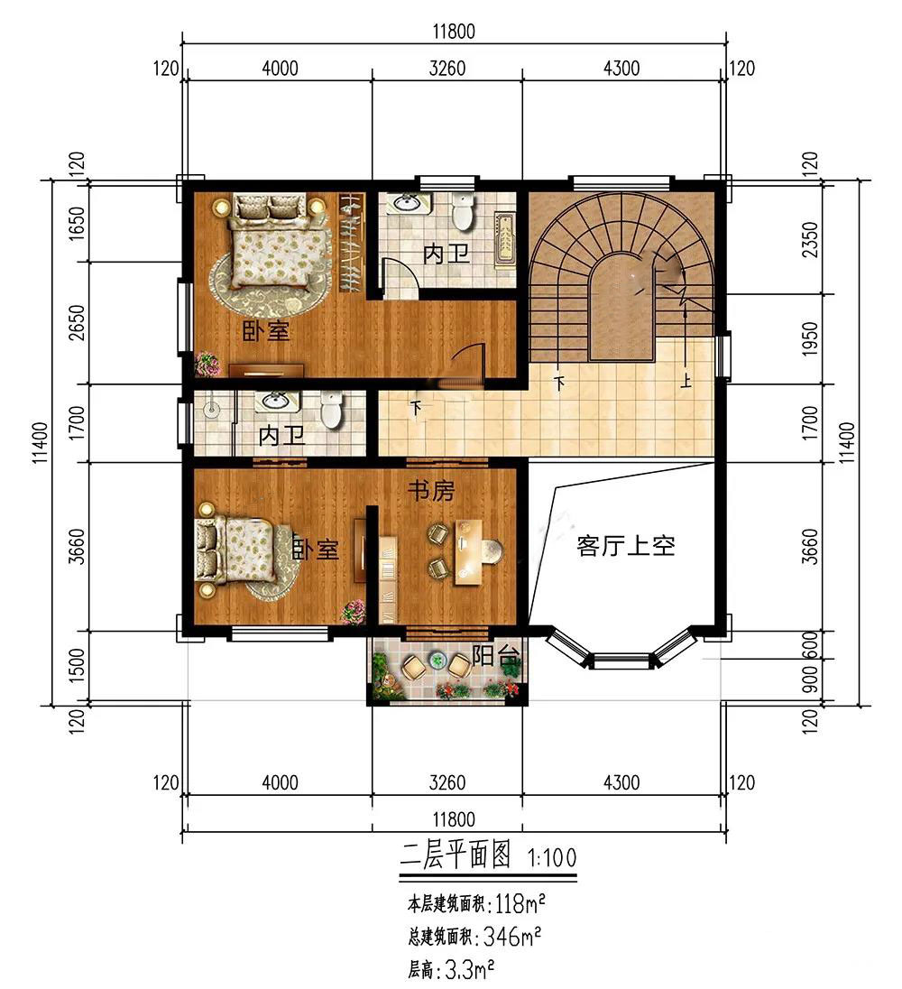 二層:挑空復(fù)式樓設(shè)計,提升家居檔次;2個臥室均是套房設(shè)計,居住便利。