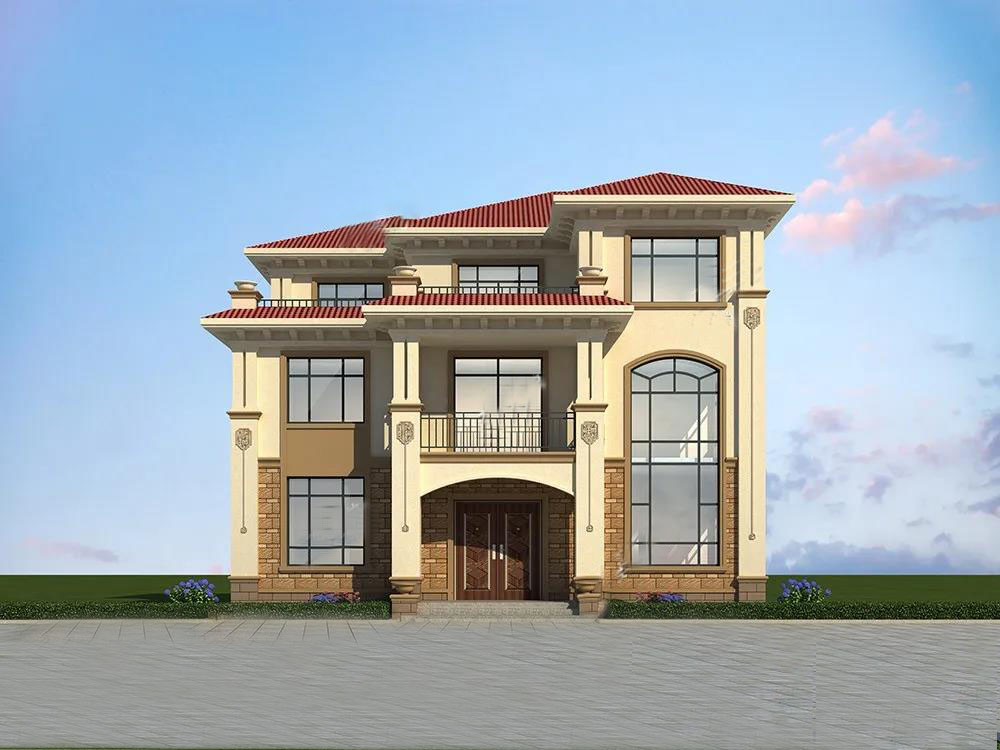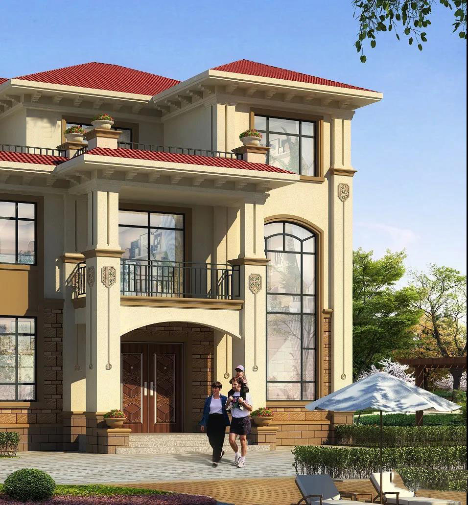 別墅屋頂采用紅色西班牙瓦,米黃色真石漆和朱紅色貼面磚裝飾墻面,色調(diào)靚麗,在鄉(xiāng)村是顯眼的存在。