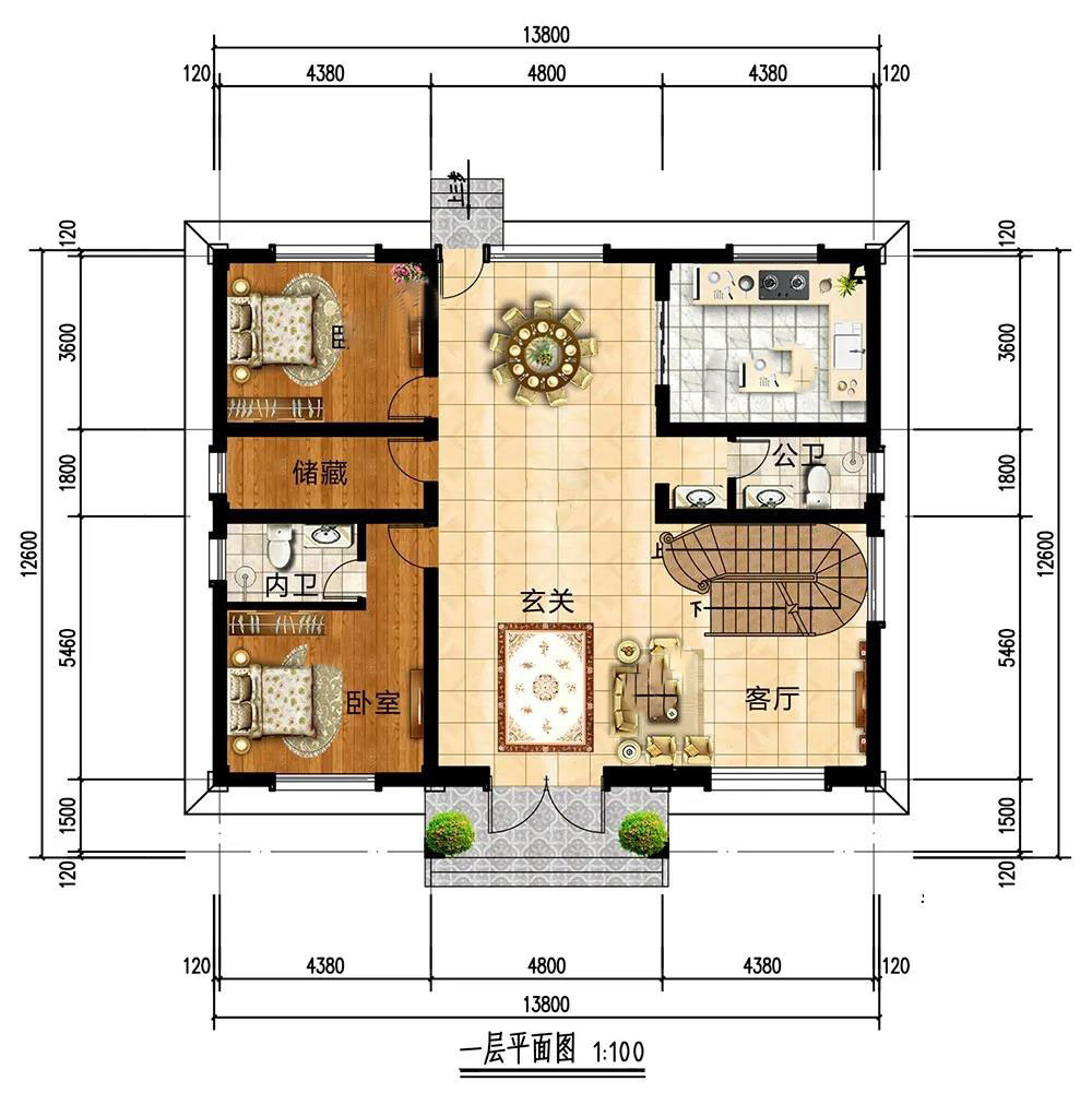 一層:旋轉(zhuǎn)樓梯,造型優(yōu)美,吸睛十足;廚房餐廳設(shè)置緊湊,營造溫馨用餐氛圍。