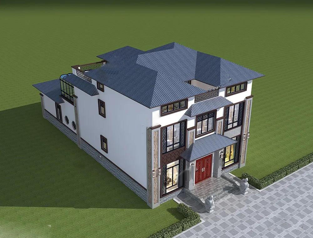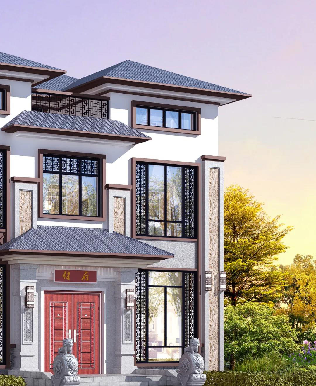 別墅屋頂采用灰色波形瓦,白色真石漆和棕色真石漆裝飾外墻,精致浮雕點(diǎn)綴,門口一對霸氣的石獅鎮(zhèn)宅旺財(cái),不失大宅風(fēng)范。