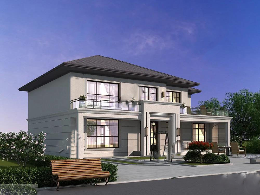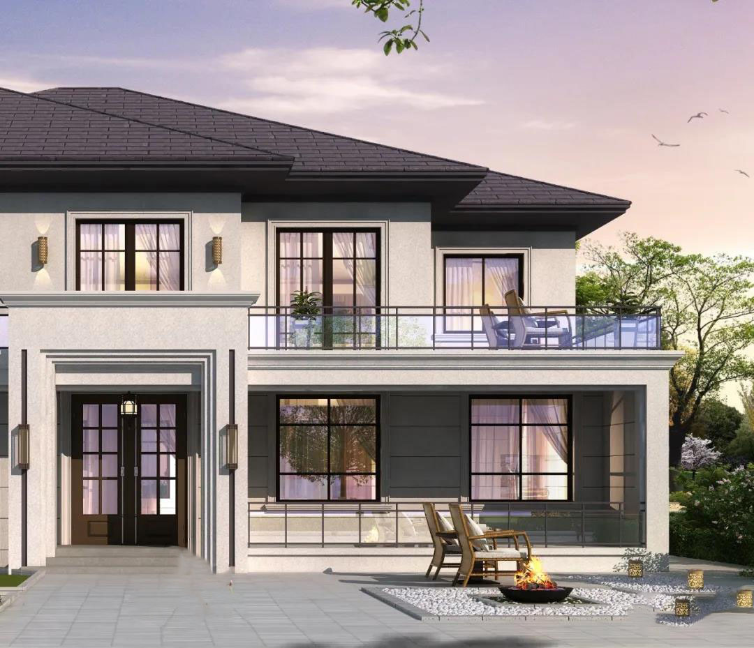 別墅屋頂采用灰色波紋瓦,白色真石漆裝飾外墻,鐵藝玻璃圍欄,顯現(xiàn)現(xiàn)代韻味。