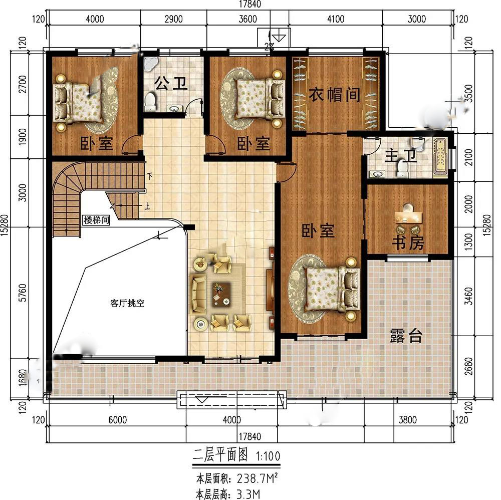 二層:3個臥室,主臥設有衣帽間、書房、露臺、衛(wèi)生間,配套完善;挑空客廳,高大上既視感。