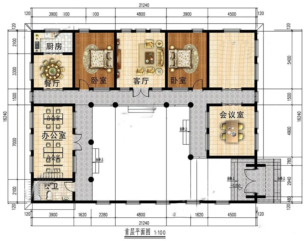 首層:東南設(shè)大門入戶,庭院開闊,可栽花養(yǎng)魚下棋,休閑活動(dòng);室內(nèi)安排了辦公區(qū),滿足起居和辦公的雙重需求