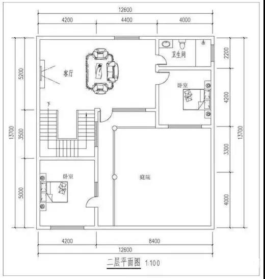 二層布局簡單,客廳面積足夠大,又有陽臺保證采光,確保了公共活動區(qū)域的良好環(huán)境,方便一家人在此進行娛樂活動。