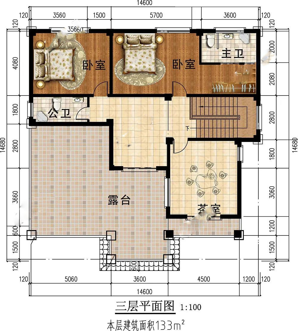 三層:臥室滿足家人起居外,還方便接待親朋好友;茶室連接露臺(tái),適合喝茶看書,晾曬衣物,種植花草,打造空中花園。