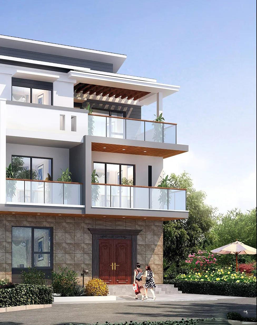 別墅屋頂采用灰色西班牙瓦,白色真石漆和灰色外墻磚搭配裝飾外墻,整體簡約大氣,多窗多露臺,采光和通風(fēng)沒得挑。