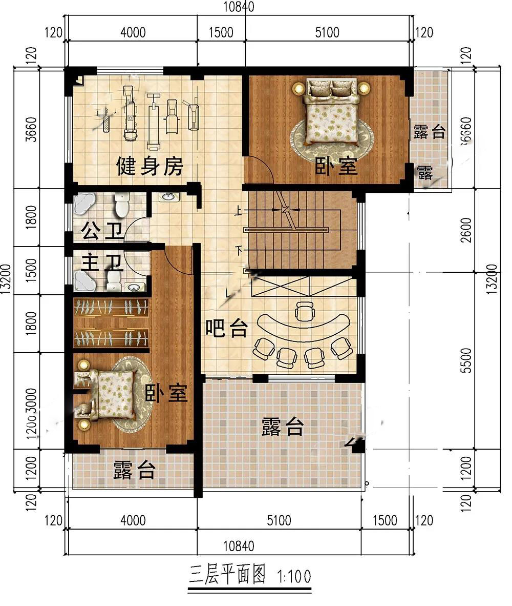 三層:吧臺和健身房時尚休閑,符合現(xiàn)代年輕人的生活方式;露臺的設(shè)計,利于通風(fēng)與采光,滿足日常晾曬。