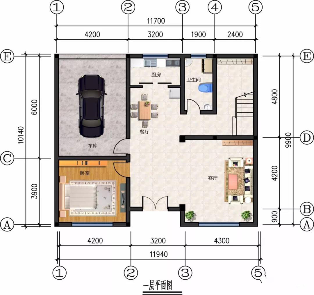一層:1室2廳1廚1衛(wèi),一層的布局很簡單,只有1個臥室供老人居住,省去爬樓梯的麻煩,同時廚房、餐廳、客廳等一應(yīng)俱全,其中北面一角位置設(shè)計(jì)成車庫,從北面開車停放,然后通過側(cè)門可直接進(jìn)入室內(nèi),方便出入。