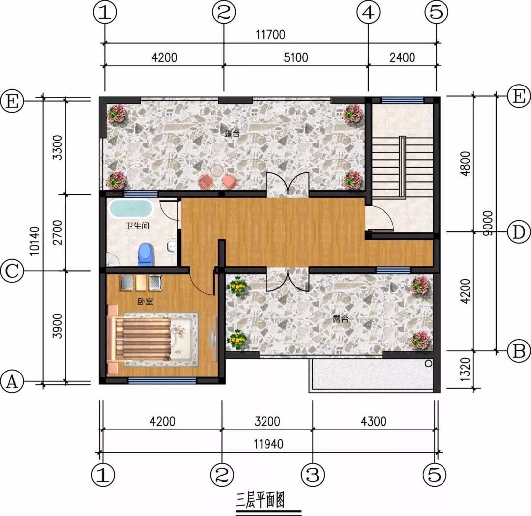 三層:本層比較偏向休閑,只有一個臥室和衛(wèi)生間可當(dāng)客房,同時南、北兩面各有一個大的外露式陽臺,可根據(jù)家庭需要進(jìn)行不同的安排,可做屋頂花園,也可種植家庭綠食,美不勝收!