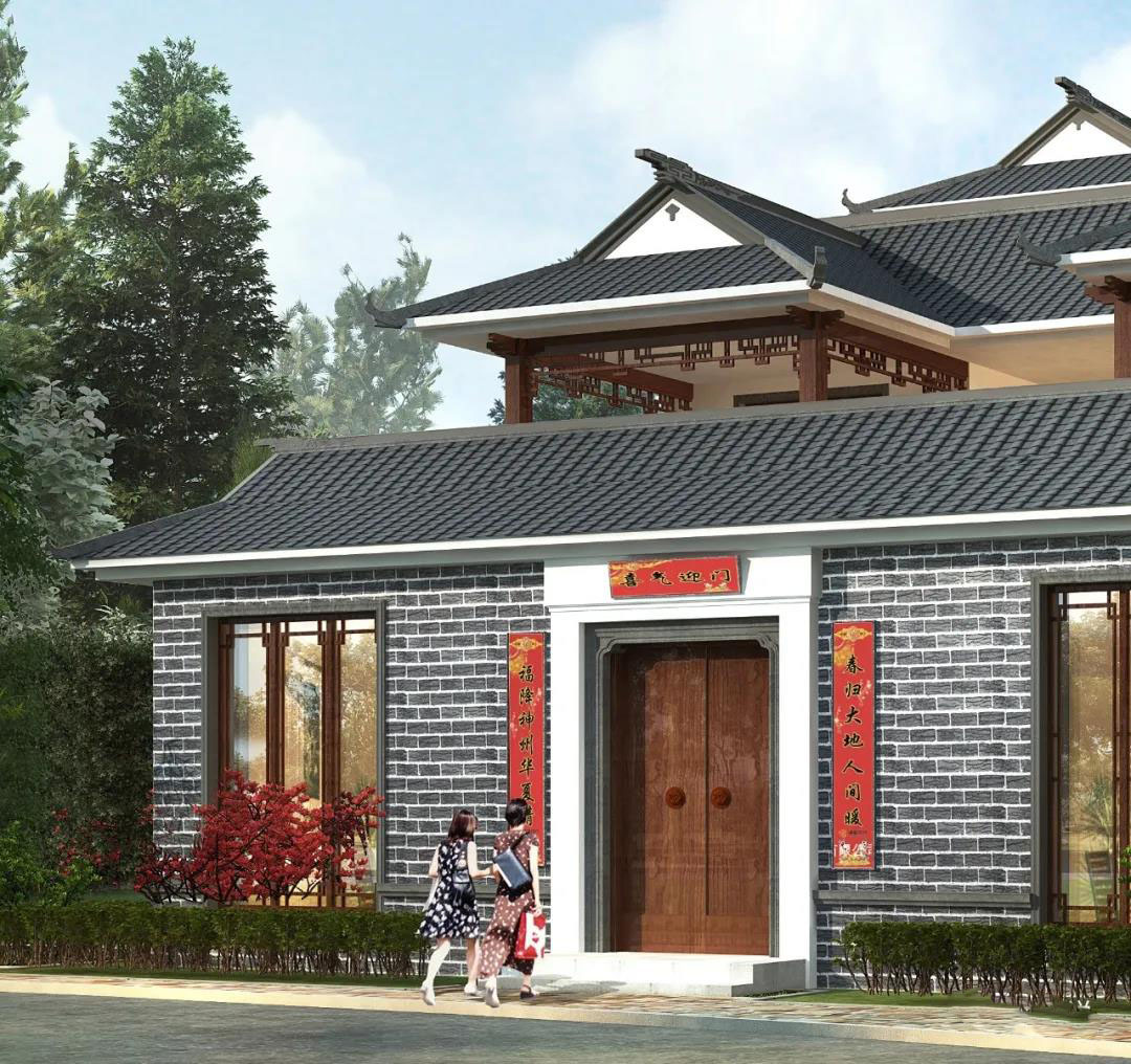 別墅屋頂采用灰色波形瓦,灰色外墻磚裝飾外墻,貼上對聯(lián),掛上紅燈籠,熱熱鬧鬧紅紅火火,一大家子人其樂融融的生活在一個屋檐下。