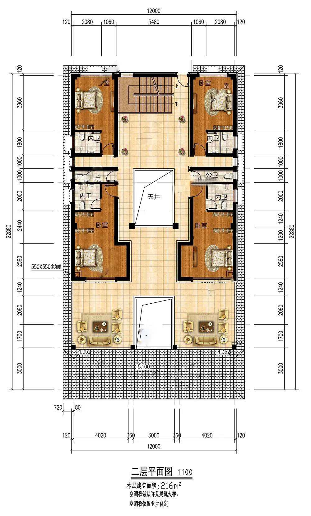 二層:4個臥室都帶有內衛(wèi),滿足起居需求,保護隱私;客廳方便家人聚會聊天,促進感情;2個挑空天井,晴天陽光照射進來,雨天雨水滴入庭院,提升財運。