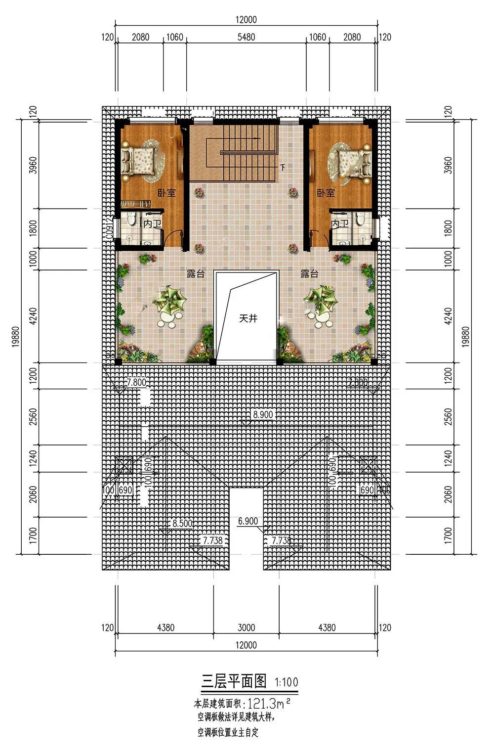 三層:臥室可當做客房使用;露臺面積寬敞,便于通風采光、觀景晾曬,打造成空中花園喝茶休閑。