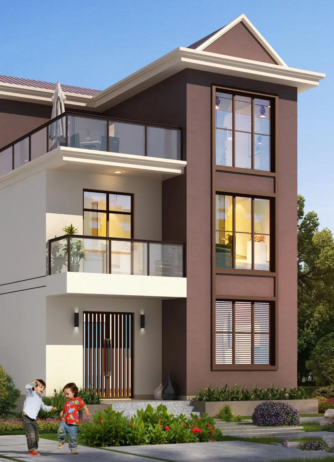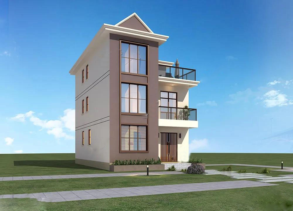 別墅屋頂采用咖啡色波紋瓦,咖啡色和白色真石漆搭配裝飾外墻,多窗多露臺,線條明朗,符合現(xiàn)代鄉(xiāng)村居住環(huán)境。