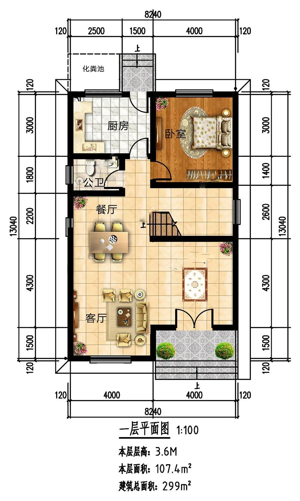 一層:入戶設(shè)玄關(guān)過渡到客廳,便于接待客人;臥室靠近洗手間,適合老人居?。粡N房在后,隔離油煙。
