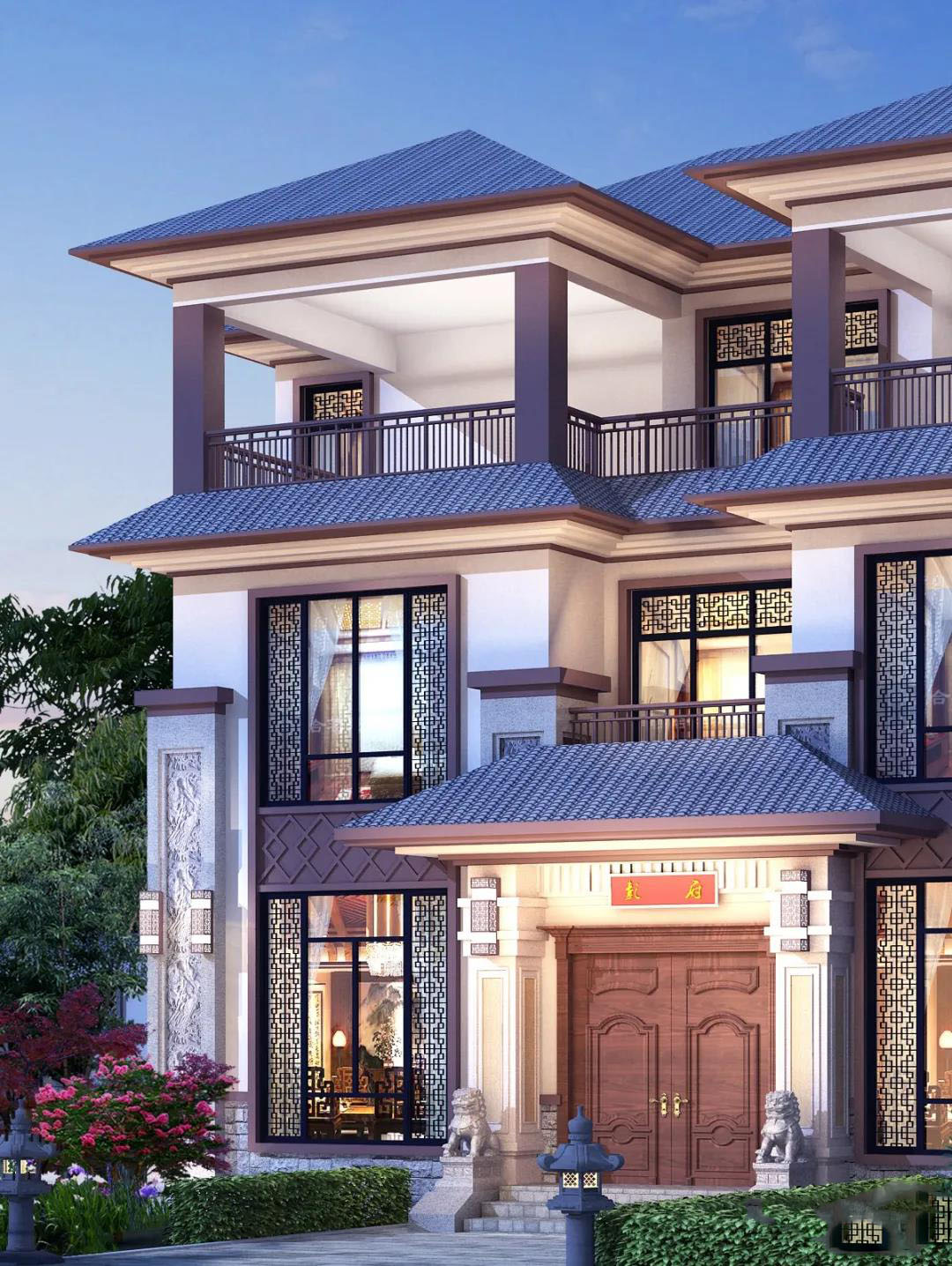 別墅屋頂采用藍(lán)色波形瓦,米色真石漆裝飾墻面,門(mén)口一對(duì)石獅子坐鎮(zhèn),配色經(jīng)典大方,細(xì)膩的線條、貴氣的浮雕在暖調(diào)的燈光下,展現(xiàn)出東方文化的內(nèi)斂氣質(zhì)。