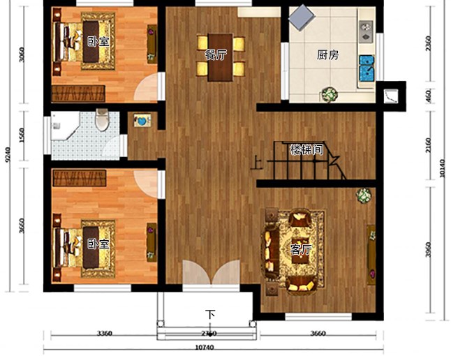 一樓別墅類型:客廳、臥室x2、廚房、餐廳、衛(wèi)生間