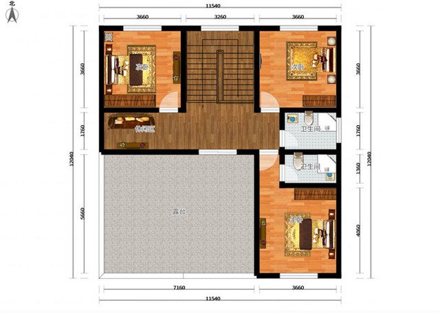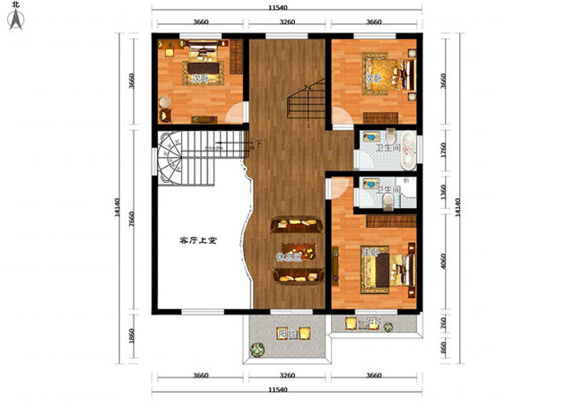 三層:小客廳、臥室x3、衛(wèi)生間、大露臺(tái);
