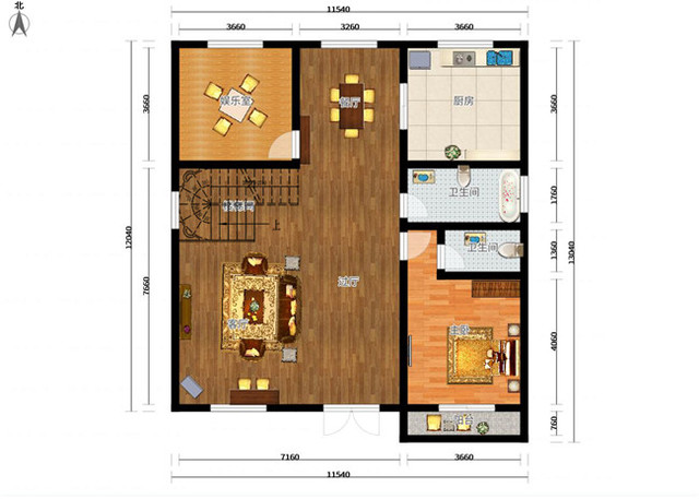 一層公寓設(shè)計(jì):大廳、客廳、餐廳、廚房、衛(wèi)生間、主臥室(帶衛(wèi)生間)和娛樂室(第二臥室);