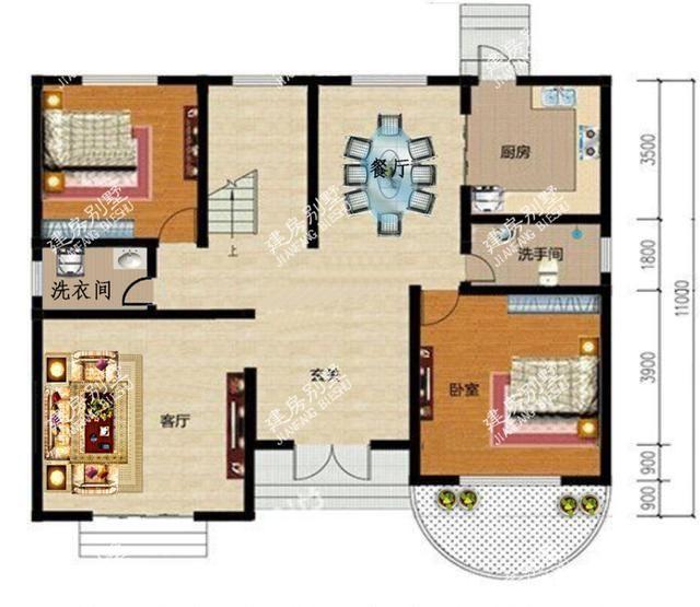 成品圖:外墻一樓用棕色和黃色瓷磚裝飾。前廳采用弧形設(shè)計。這座別墅建造簡單,建成后非常醒目。