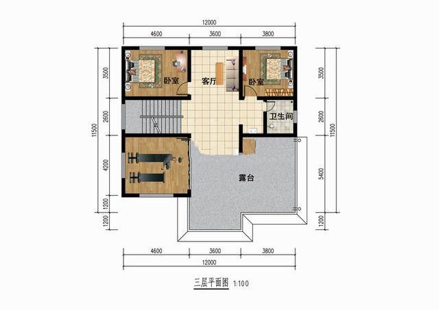 北二角三樓有兩間臥室,西南角有一個健身房,東南角有一個大露臺,可以讓健身環(huán)境更舒適。陽臺也可以滿足晾曬的需要。