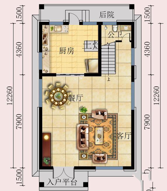 別墅門廊可以布置鞋架、綠色種植等,客廳、餐廳自然過渡,提供寬敞的大氣視覺效果,款待客人顯示出舒適的樣子;洗手間安裝在樓梯下,有效地節(jié)約空間。廚房里符合農(nóng)村生活習(xí)慣,具備與餐廳相鄰的設(shè)計,便于外出就餐。