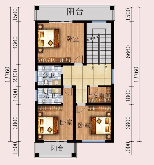 第二層樓層平面:3個臥室、2個衛(wèi)生間、衣柜、陽臺。