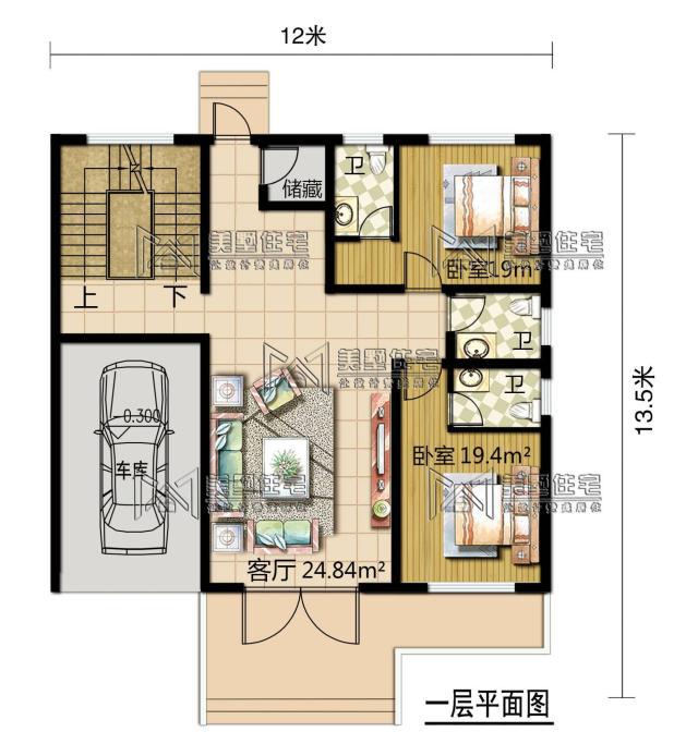 一樓配有車(chē)庫(kù)、客廳、廚房和臥室。