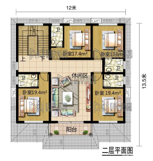 二樓設(shè)有陽(yáng)臺(tái)、休閑區(qū)和四間臥室。