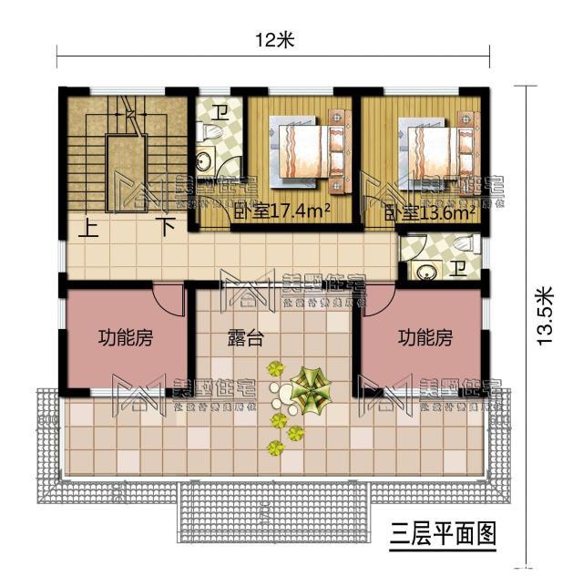 三樓有陽(yáng)臺(tái)、功能房和兩間臥室。