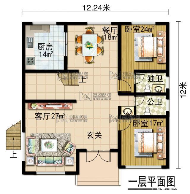 一樓設(shè)有玄關(guān)、客廳、廚房、餐廳和臥室。