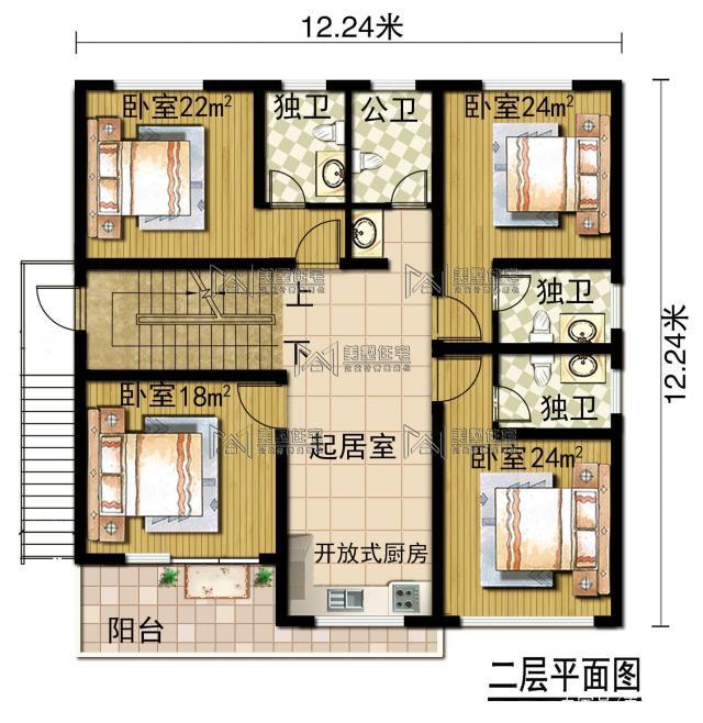 二樓配有開放式廚房、客廳、陽臺(tái)和臥室。