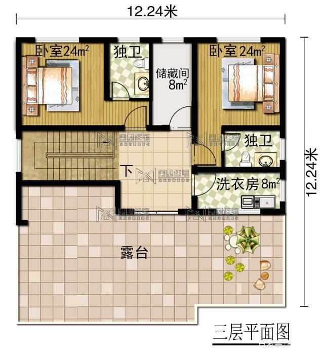 三樓配有一個(gè)大露臺(tái)、洗衣房、儲(chǔ)藏室和臥室。