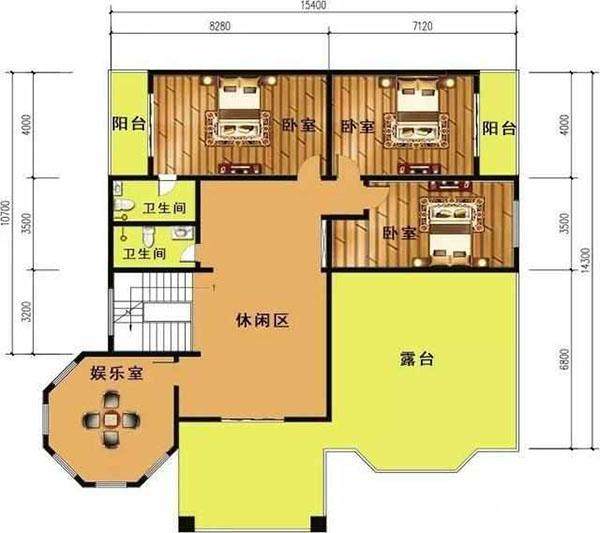 二樓和三樓有六間臥室和兩間娛樂(lè)室,還有娛樂(lè)區(qū)、廁所和陽(yáng)臺(tái)。總體布局基本相同。這座三層建筑的特點(diǎn)是有一個(gè)大露臺(tái),既方便農(nóng)村地區(qū)的日常通風(fēng),又是一個(gè)娛樂(lè)場(chǎng)所。從總體布局來(lái)看,上下水構(gòu)筑物的線形在一定程度上降低了施工難度,適合廣大農(nóng)村地區(qū)施工。
