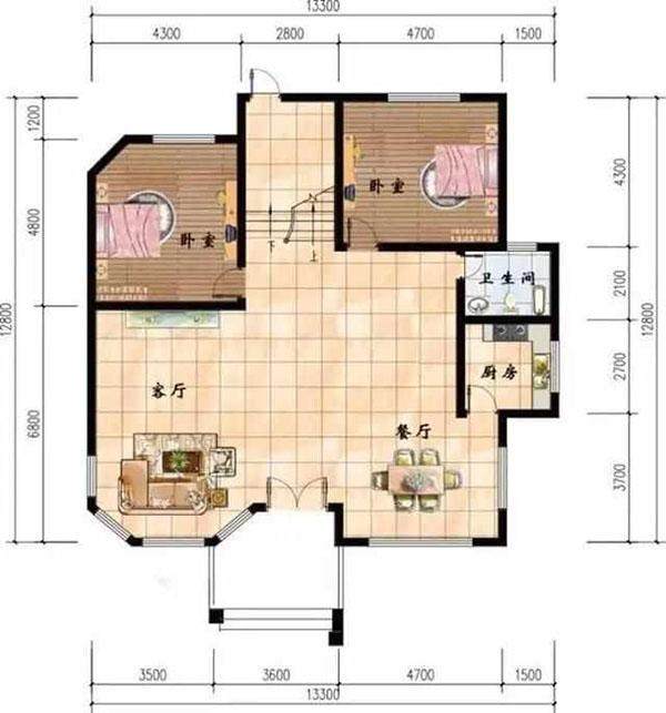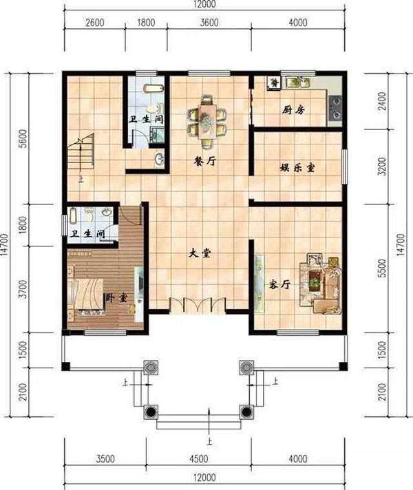 一樓配有客廳、餐廳、廚房、衛(wèi)生間和兩間臥室。有兩個(gè)入口平臺(tái),在北面和南面相對(duì)。他們方便進(jìn)出。餐廳和客廳相互連接。區(qū)域?qū)挸ǎ曇伴_(kāi)闊,通風(fēng)采光效果好。