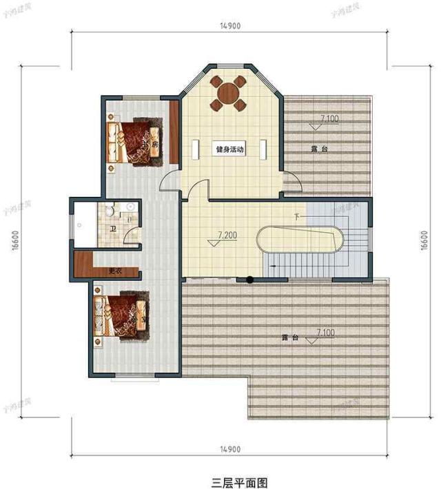 房屋概況:該房屋類(lèi)型為215平方的房屋設(shè)計(jì)圖,帶有一個(gè)大露臺(tái)。該圖以青色和白色為主色調(diào),明暗對(duì)比鮮明,突出了立面的立體感和層次感。室內(nèi)有不同功能的臥室,并且多樣化和靈活。
