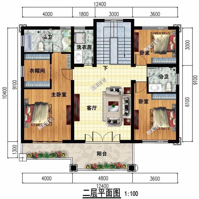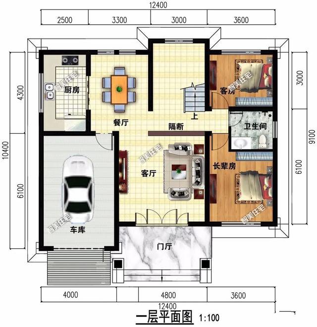 2單元:12.410.4米,落地式大窗戶,三開間設(shè)計(jì),帶中央大門,公式柱裝飾,外墻用黃色真石漆拼縫裝飾,屋頂用紅色瓷磚。