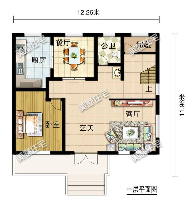 一樓設(shè)有玄關(guān),客廳、一主臥室,、衛(wèi)生間、廚房、餐廳。一樓的布局比較緊湊,一間臥室可以改成老人房