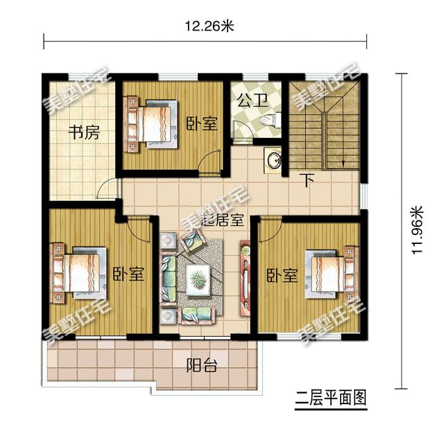 二樓設(shè)有起居室通陽臺(tái),書房,三臥室,衛(wèi)生間,二樓的主要面積是居住的,但活動(dòng)的空間還是蠻大的