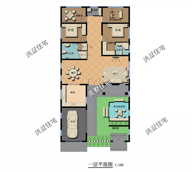 一樓有個大院子,進門就有個留影壁,讓院子更加的有古風感??蛷d,車庫,廚房,餐廳,陽光房,棋牌室,健身房,共有兩個臥室?guī)б旅遍g與廁所。