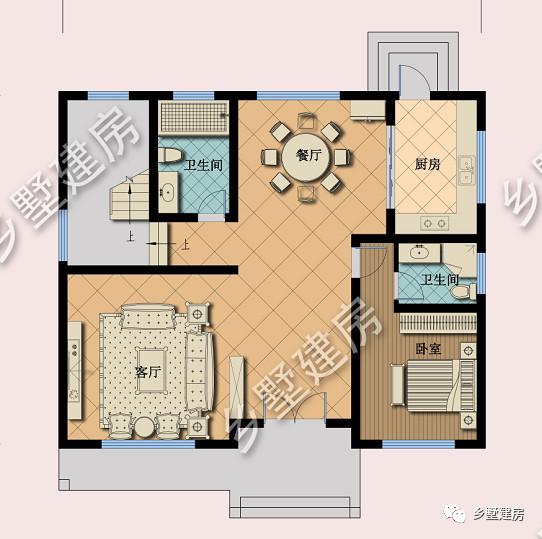 一層設(shè)計(jì)門(mén)廊,入室有門(mén)廳,客廳,臥室,餐廳,廚房,衛(wèi)生間,設(shè)計(jì)簡(jiǎn)單,功能齊全,尤其是臥室,面積比較開(kāi)闊,設(shè)計(jì)獨(dú)衛(wèi),方便使用