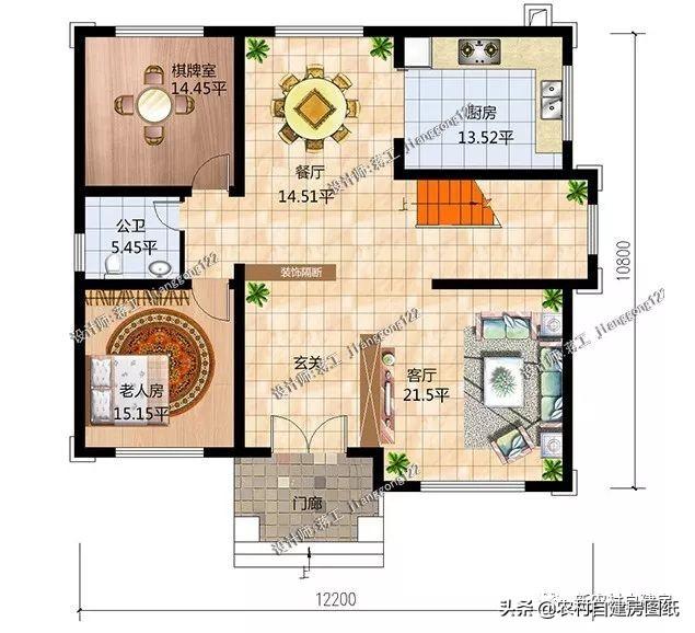 這是一款現(xiàn)代中式風(fēng)可格的農(nóng)村小別墅,戶型占地面積不大,開間12.2米,進(jìn)深10.8米,占地面積133平方米,主體造價30萬左右。