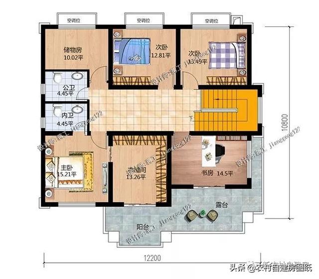 二層為居住空間,共設(shè)有3間臥室,主臥室?guī)в幸旅遍g和衛(wèi)生間,并有獨(dú)立的書房和儲藏室,書房連著屋頂露臺,露臺非常大,休閑觀景或者花園陽光房都可以。