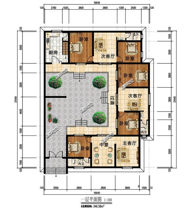 一層:中堂、客廳、5個臥室、3個洗手間、廚房