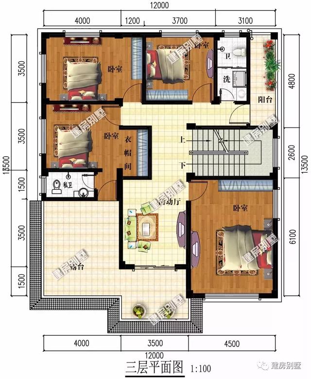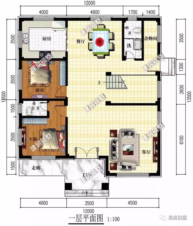 歐式別墅二:12×13.5米,占地面積166.9平方米,建筑面積479.48平方米,框架結(jié)構(gòu),墻面用黃色真石漆裝飾,配藍(lán)瓦。