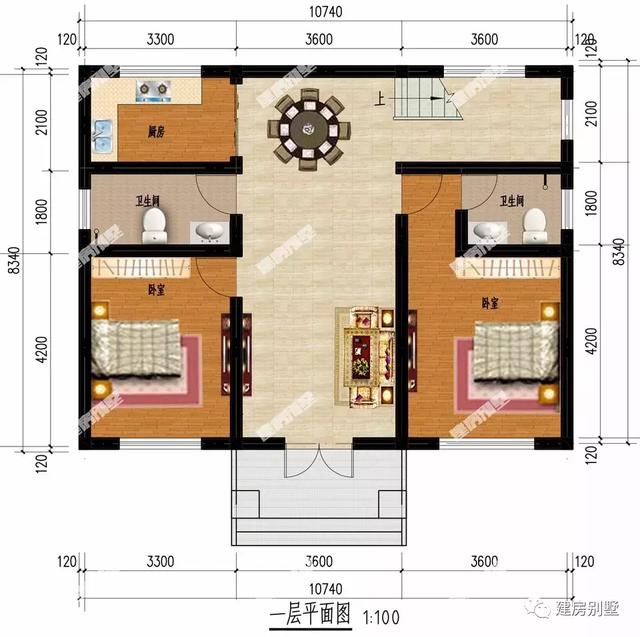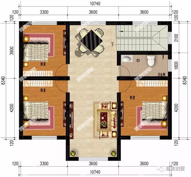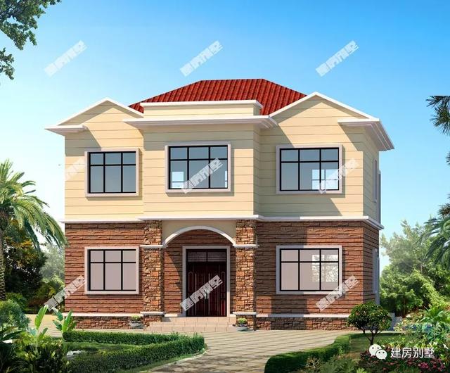 第二棟小別墅:10.74×8.34米,墻面裝飾 也是用面磚、文化石和真石漆等材料裝飾,屋面配紅瓦,戶型外觀基本上是對稱設計。