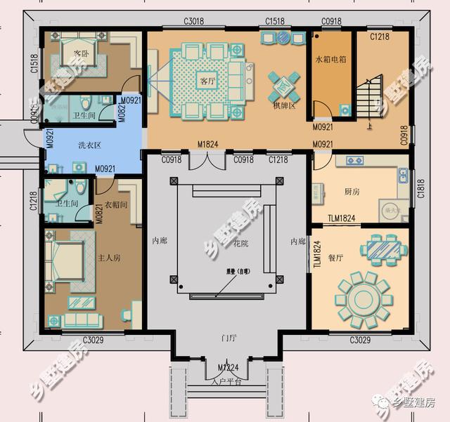 從大門進(jìn)去后是一個大面積花園,廚房及餐廳在花園的東邊,餐廳放置有一大一小兩張餐桌,平時自家人用餐用小餐桌就足夠,有客人來訪就在大餐桌上就餐,十分方便。客廳設(shè)在花院北邊,客廳為挑空設(shè)計,讓室內(nèi)布局更顯大氣,客廳中設(shè)有棋牌區(qū),親朋好友來訪可以打打牌娛樂一下。一樓設(shè)有一間主臥一間客臥,主臥可以給家中老人居住,不用上下樓梯,起居方便。車庫設(shè)在主樓西側(cè),主樓有通往車庫的走廊。