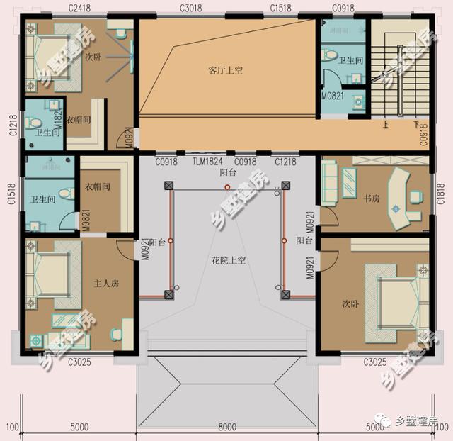 二樓設(shè)有一間主臥兩間次臥,主臥中設(shè)有衣帽間及獨立衛(wèi)生間,東側(cè)設(shè)有一間書房,可用作平時辦公及學(xué)習(xí)場所?;▓@上空設(shè)有陽臺走廊,從二樓也能欣賞花園的美景。