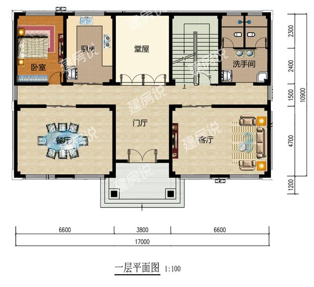 一層:客廳、堂屋、臥室、衛(wèi)生間、廚房、餐廳