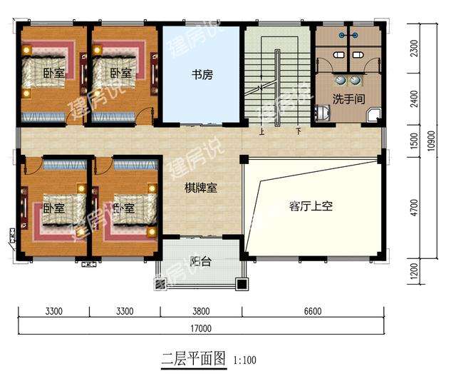 二層:客廳上空、4個(gè)臥室、書房、衛(wèi)生間、陽(yáng)臺(tái)